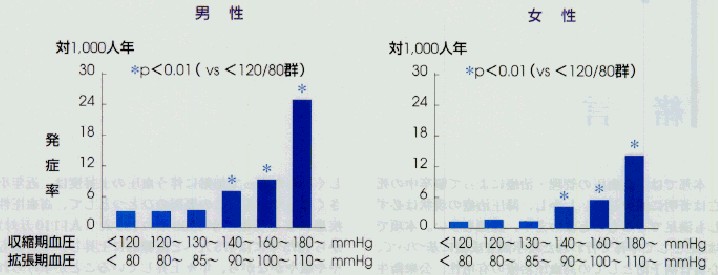 高血圧症を治療する目的は、心血管疾患を予防することにあります。この観点から上の図を見てください。血圧が140/90mmHg以上になると脳梗塞になる率が高くなることがおわかりいただけると思います。