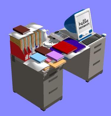 その汚い机をコンピュータグラフィックで表現してみると下のような感じ。