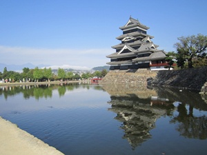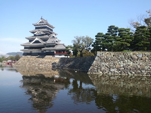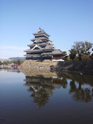 お堀の池にきれいに松本城が反射している