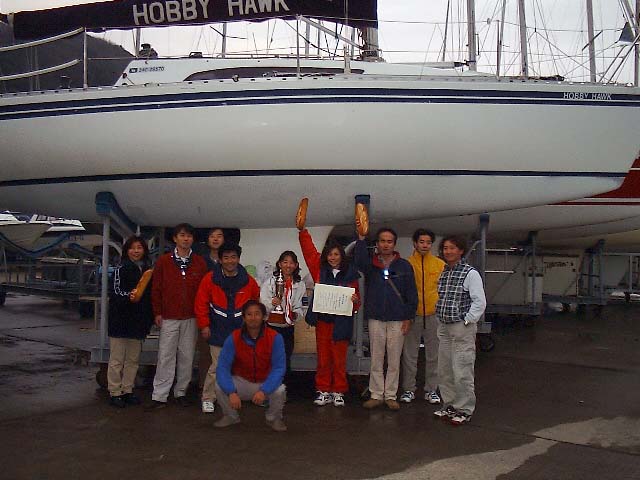その後、パーティーでは偽エンジントラブルを暴露され、クルー全員前へ出て腕立て伏せの刑。今日は森戸の居酒屋・まるひでさんがスポンサーのレースだったので、大きなトロフィーと、賞状「酒池肉林券まるひで飲み食い一発勝負おつりなし金参萬円分」の副賞をゲーーーーーーット。今日はHOBBY HAWKらしからぬ、もとい 知的なHOBBY HAWKらしい丁寧で冷静なコース取りが良かったですねえ!