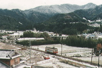 雪景色の中を走る小さな電車 野上電鉄 (94.2.12)