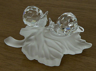 「葉とカタツムリ」の作品同様、磨りガラスの葉っぱの上に赤ちゃんカタツムリが2匹乗っています。デザイナーは同じ人のようです。 親カタツムリの葉っぱは原タイトルではVine Leafなので、ブドウの木ですね。こちらは単にLeafですが、やはりブドウなんでしょうか(謎)。