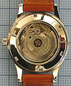 裏スケから見えているムーブは、ETAの2824-2です。8振動で緩急微調整装置も備えており、たくさんの時計に使われている息の長いキャリバーです。ローター受けのボールベアリングは、昔のエテルナに似ています。やっぱり血は争えない、ということでしょうね(笑)。