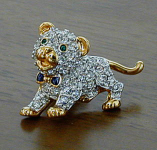 ゴールドとシルバーにクリスタルを組み合わせたライオンのピンブローチです。