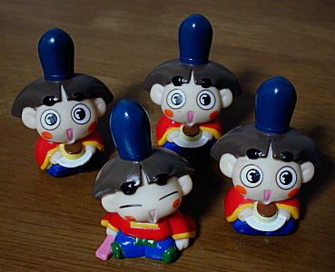 ヘイアンチョウからやってきた、坂ノ上おじゃる丸です。エンマ大王からくすねたシャクと、プリンが大のお気に入り。ミヤビでやんごとなきお子さまだそうです(笑)。 プリンを持ってるおじゃる丸が3つもあるのは、パート3のシリーズでタナカヨシコだけがどうしても揃わないからです(苦笑)。 もう一方のおじゃるはパート2ですが、ちょっと顔が変ですね。