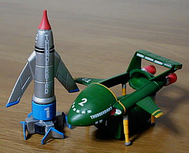 説明する必要がないと思われる、サンダーバード1号と2号です。たまたま入ったオモチャ屋さんで、ガシャポンのセット売りを見つけ、衝動買いしました(5号はその後、運良く自販機から1回で入手)。 やっぱりヤシの木が倒れてTB-2が発進していくシーンが、一番印象に残ってます。